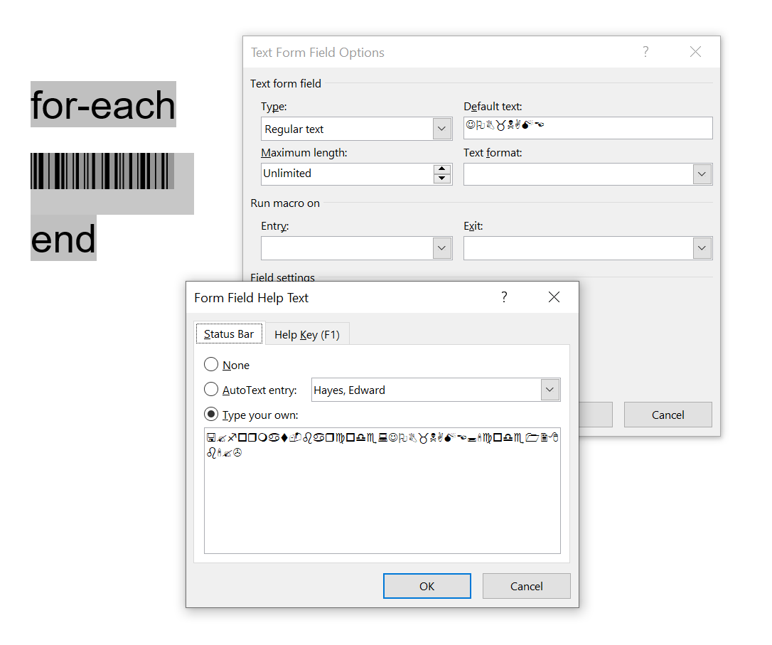When investigating the issue, we ran into another bug where Microsoft Word would show these windings type symbols when displaying the properties of the barcode element: