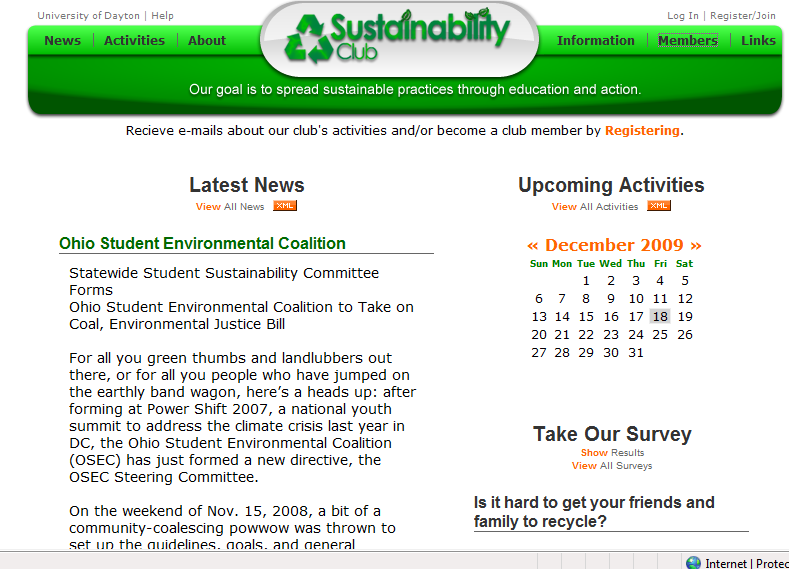 The goal of the Sustainability Club website was to provide club and general sustainability information to University of Dayton students, faculty, and alumni. The site had many fully functional features including: